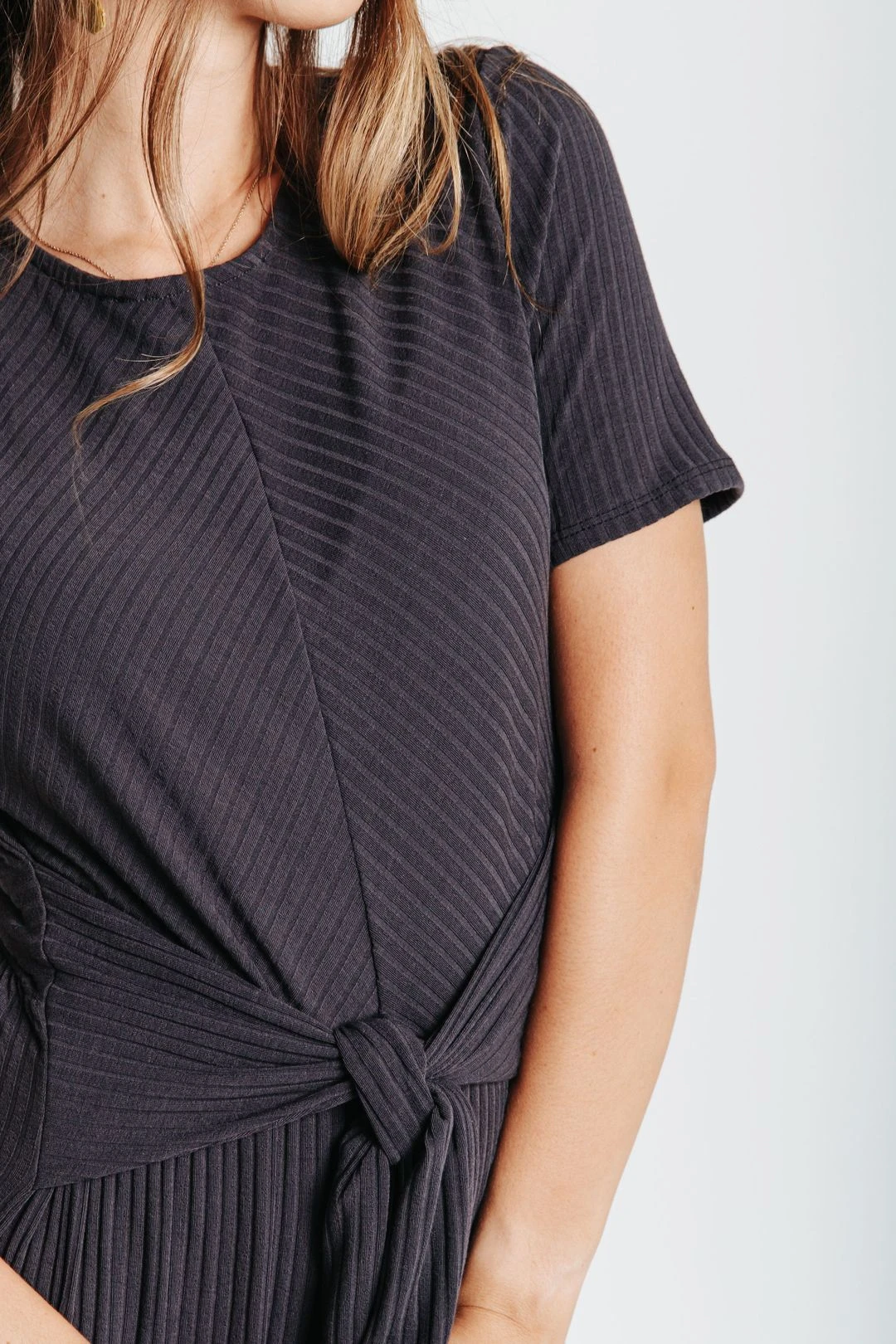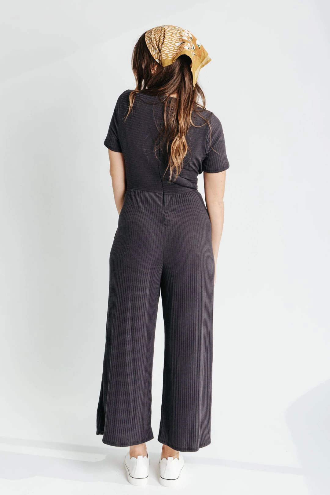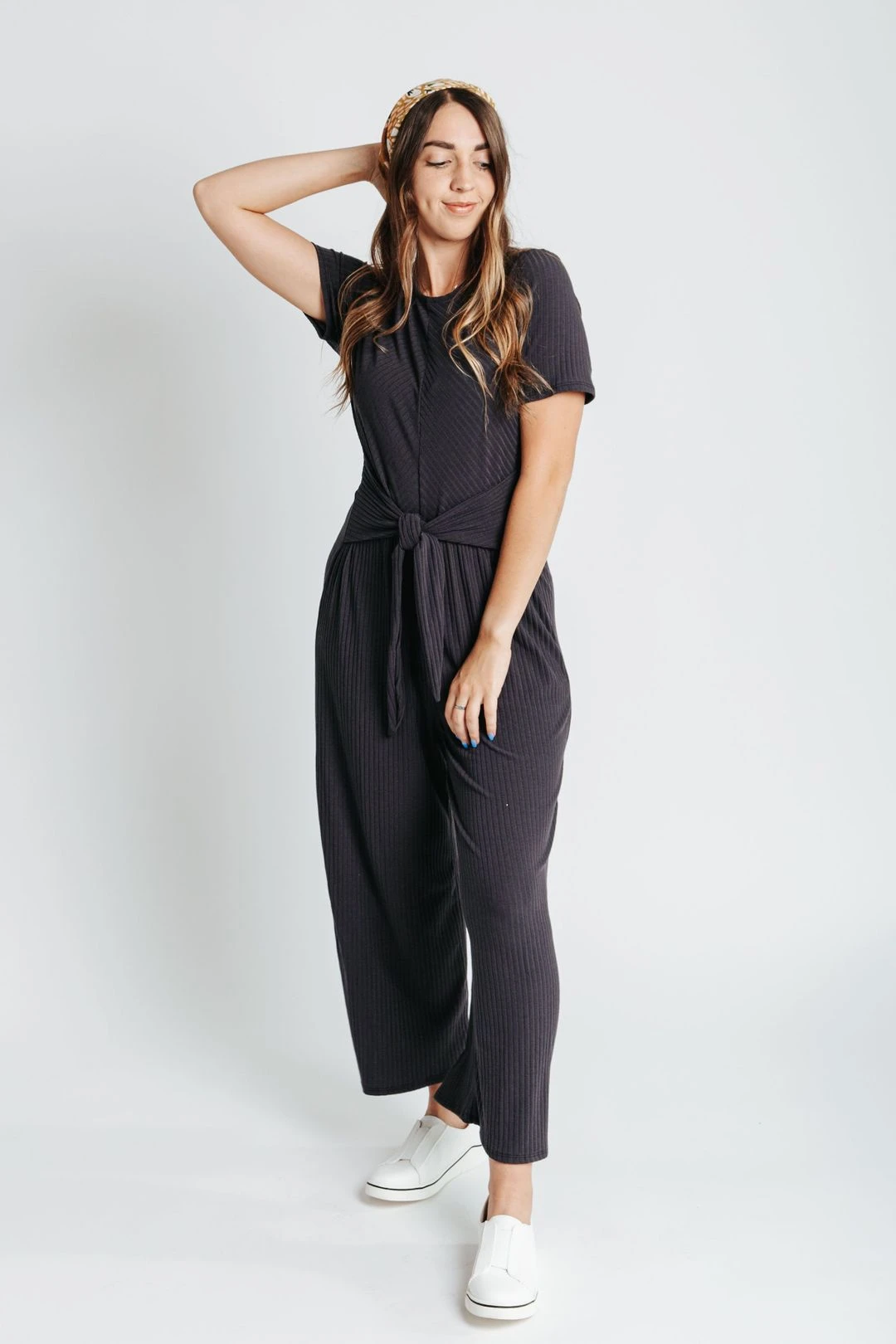 This jumpsuit is stretchy with a knot tie on the front. It has a wide + cropped leg. It can be dressed up or down but don’t leave home without it.Â