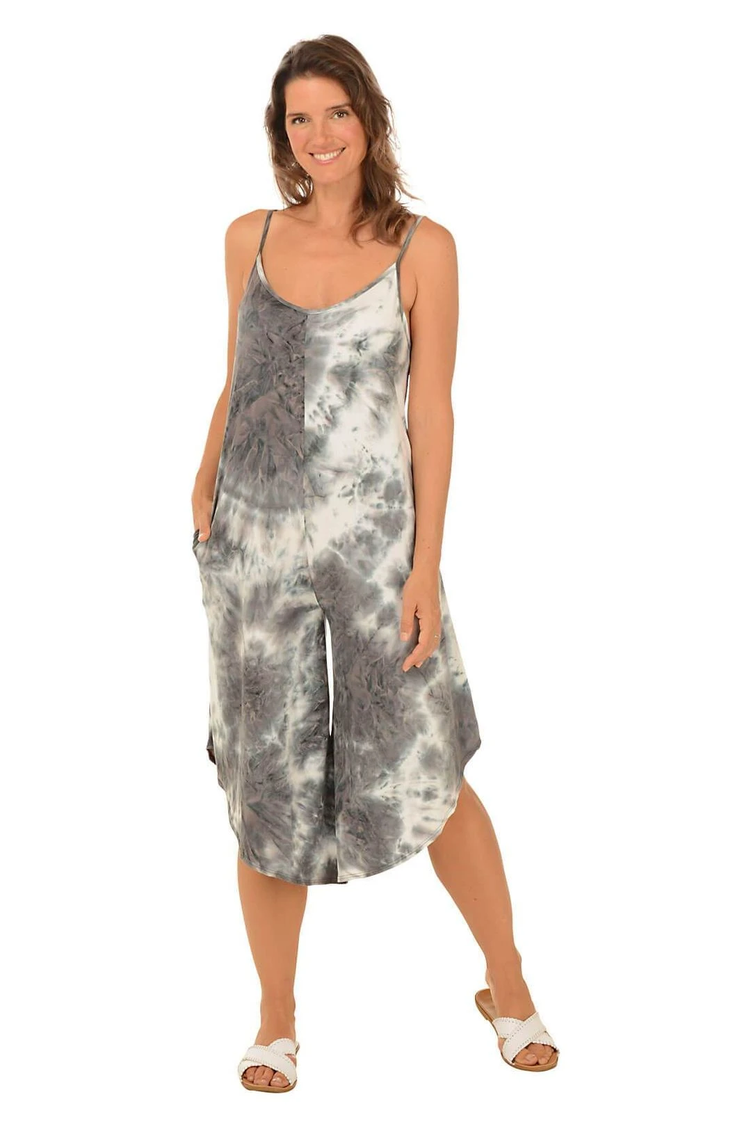 With thin camisole straps and a deep scoop neckline, this J. Valdi tie-dyed jumpsuit is as pretty as it is comfortable. It is loose-fitting and perfect for wearing as a cover-up when going to the pool or beach. This easy-to-wear jumpsuit is a great way to cover up in style!