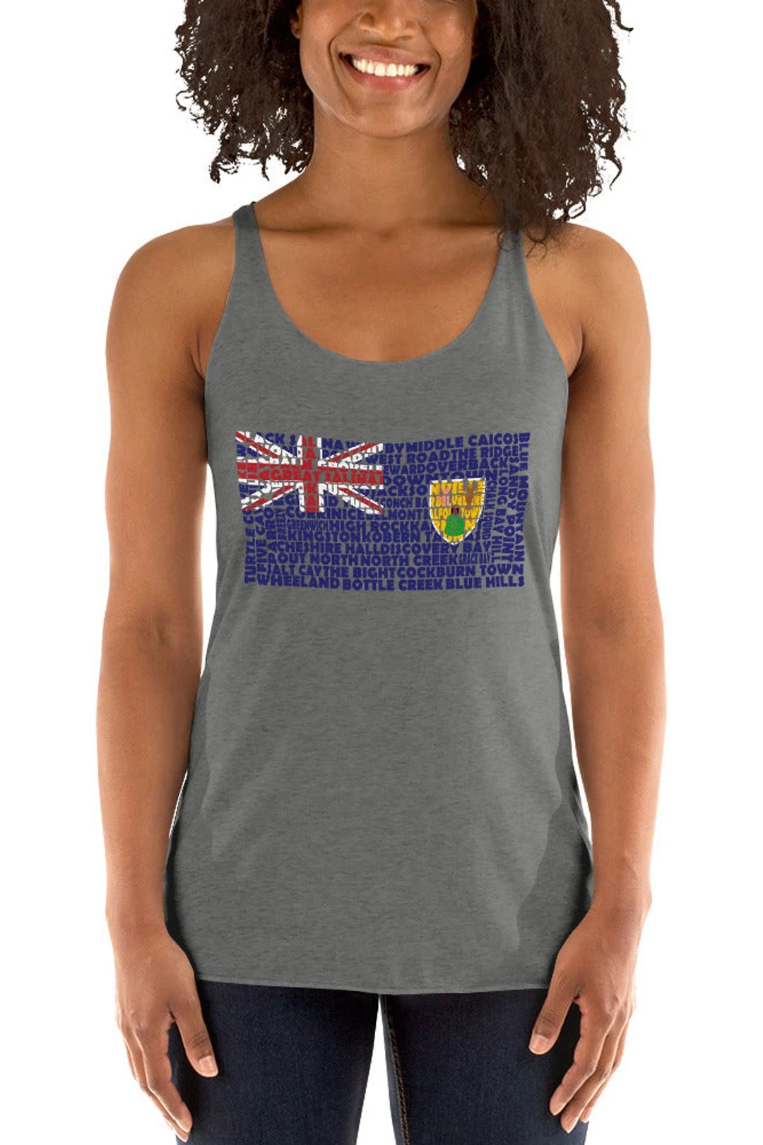 Represent Turks and Caicos with this women’s tank top designed with the Turks and Caicos flag stenciled from its towns and cities. This Tank Top is soft, lightweight, and form-fitting and perfect for working out or just casual wear. Be patriotic with your daily routine.