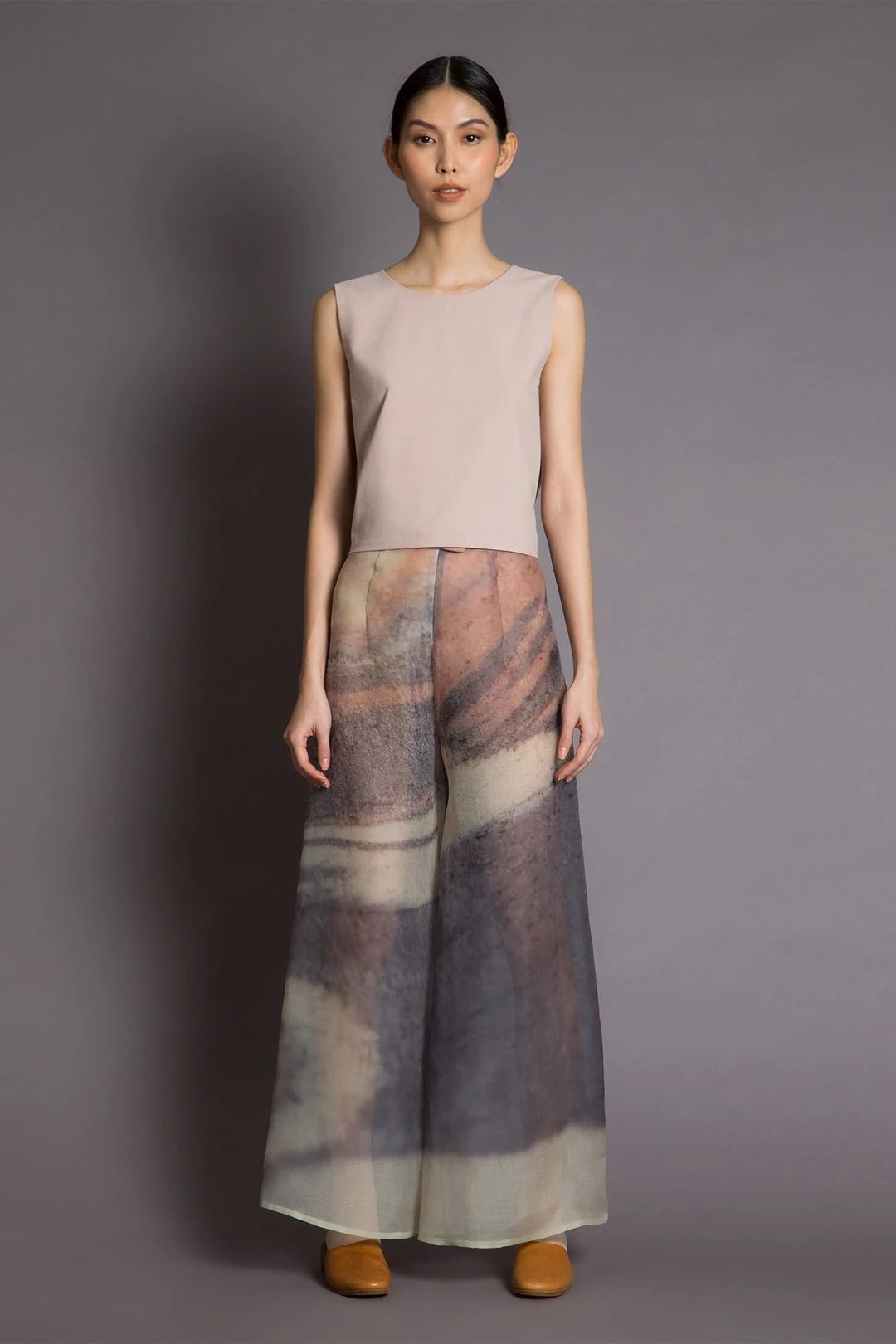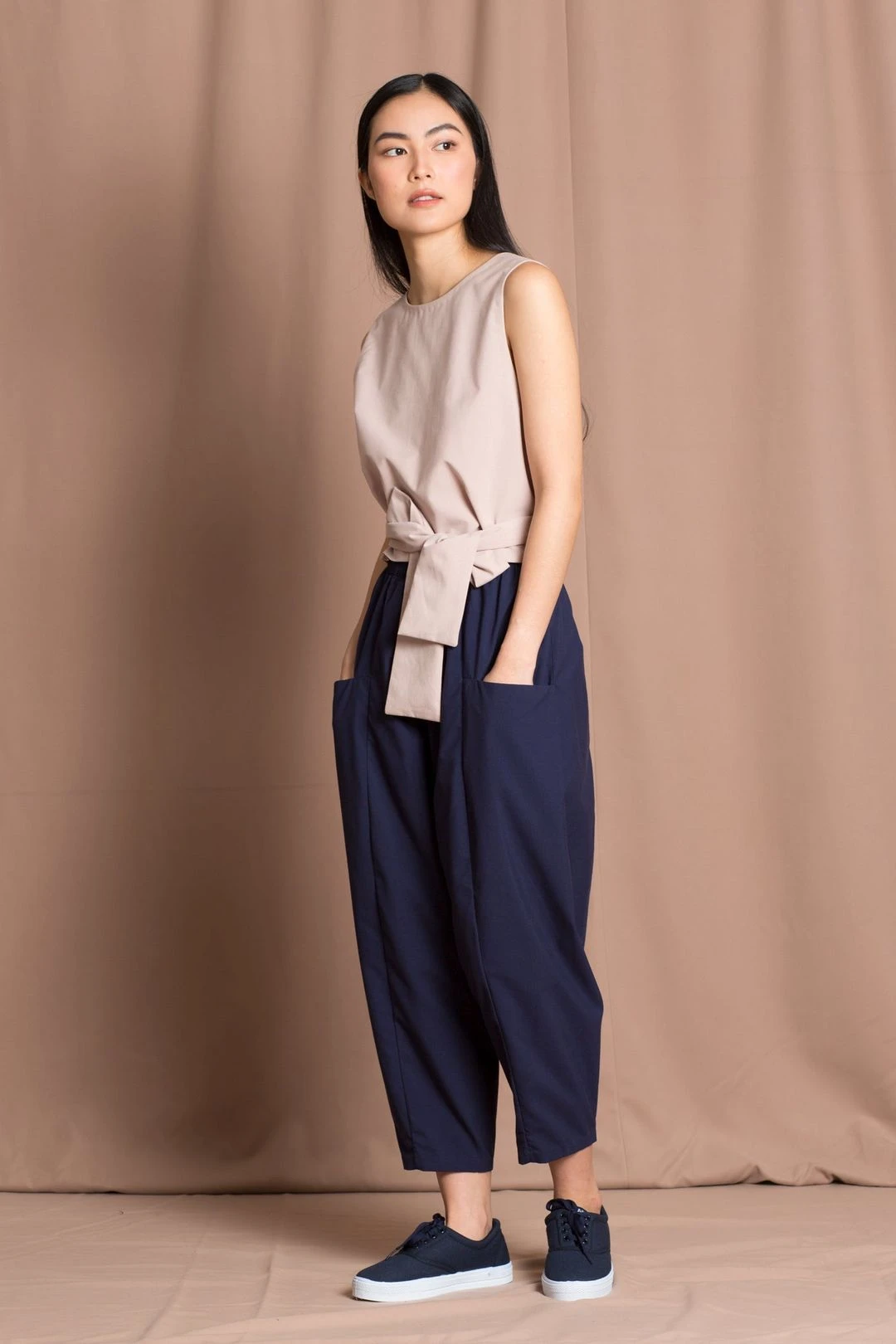 Sleeveless round neck top with an overlapping v neck back. You can wear it reversed with the v neck in the front as well! The bottom panel of the shirt extends into two side ties that can be wrapped around the waist, or tied in the front, or the back for variation in looks.