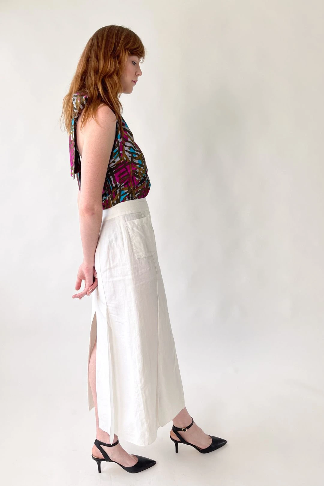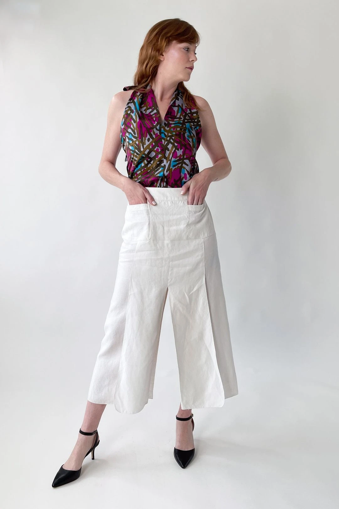 Classic and unique simultaneously…the genius of Karl Lagerfeld!ย Lightweight white linen.ย Longer length.ย Deep slits in the front and back.ย Front patch pockets.ย The skirt is constructed in such a way that, at first glance, it appears to be pants.ย ย Side button opening with CC buttons.