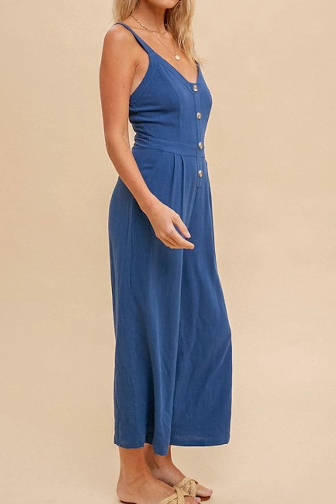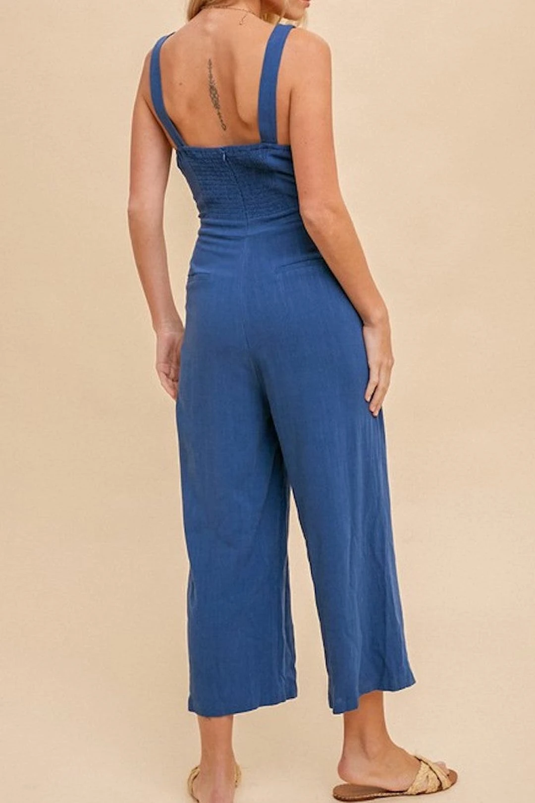 Why we love it We love the vibrant color of this button up jumpsuit. Featuring a smocked back and a back zipper closure.