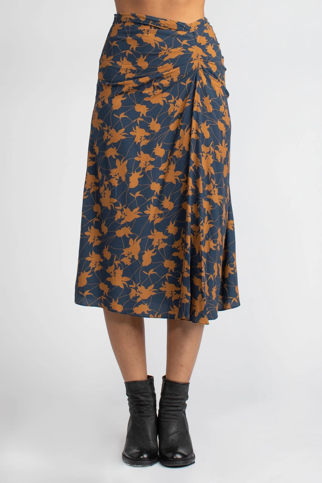 We’d like to introduce you to your new favorite midi skirt. Violette swings sweetly to mid-calf, her high-slung waist featuring a ruched detail that creates a pretty and feminine drape. Style with a cropped sweater or our Silk Tee, and finish with booties, heels, sandals, or sneakers.
