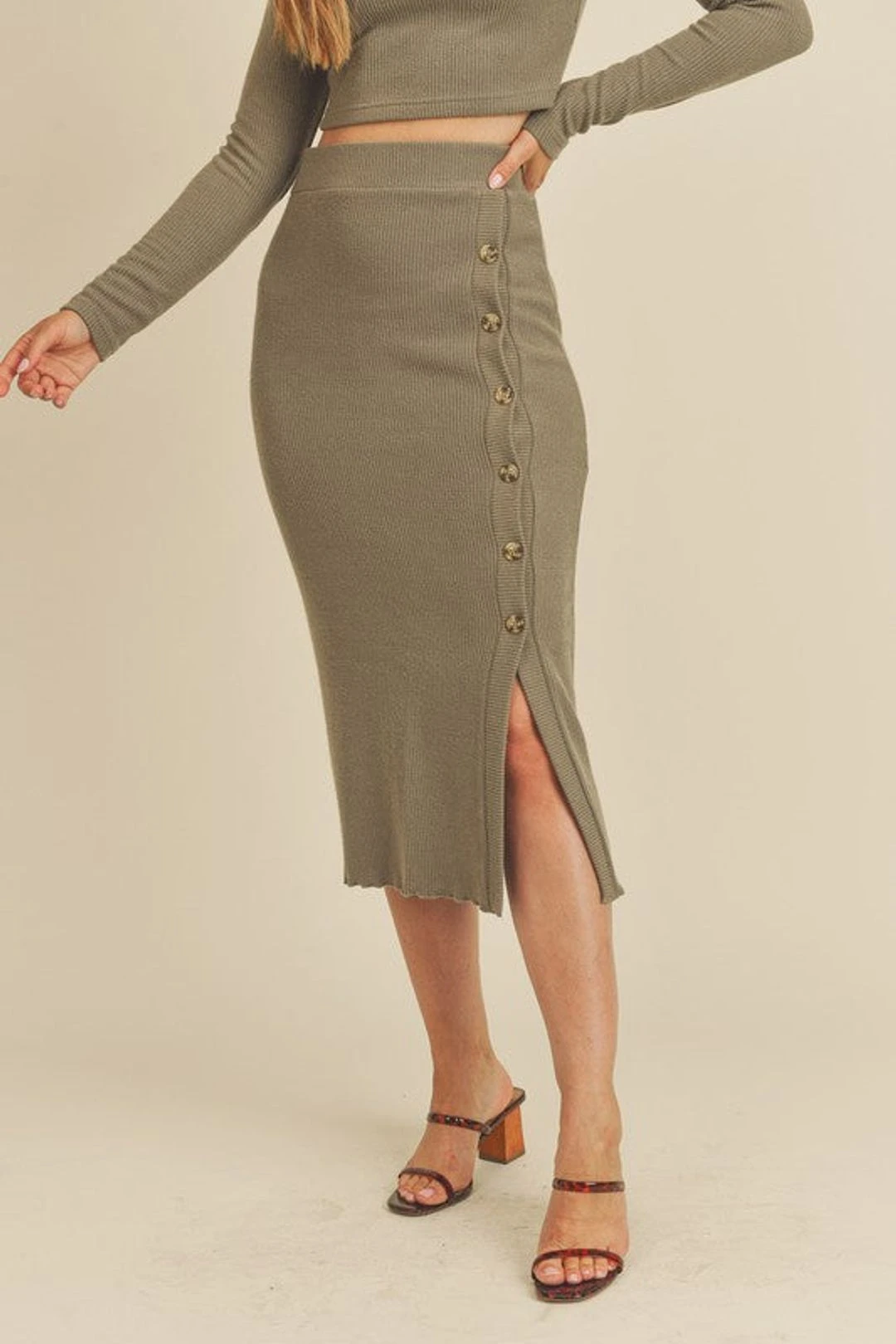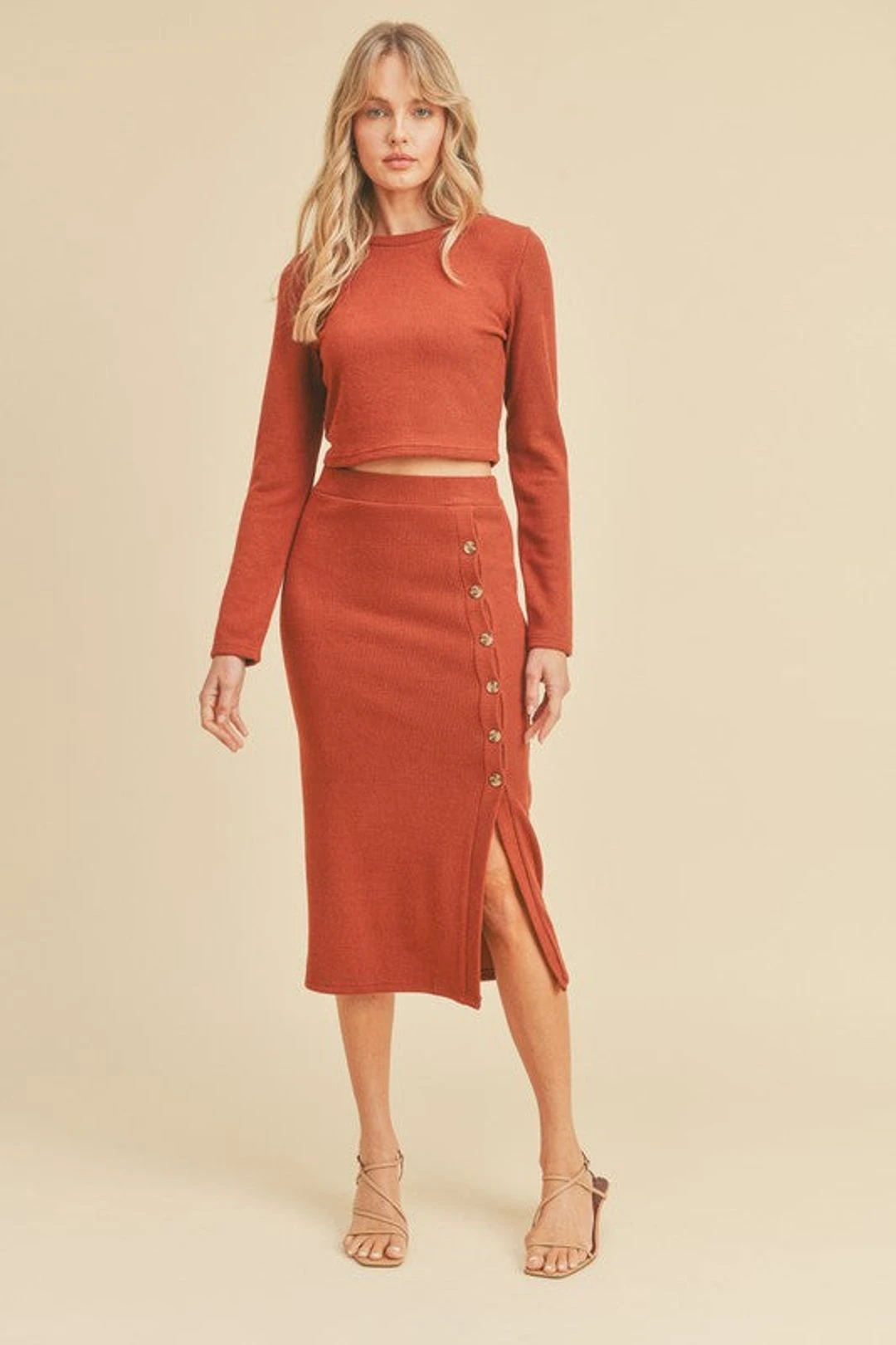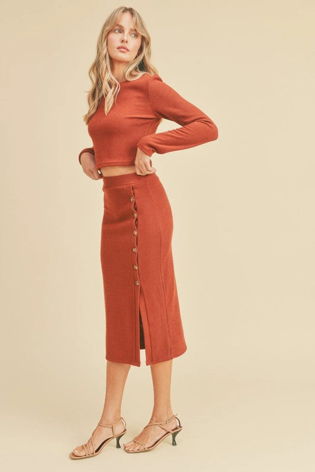 Our ribbed-knit midi skirt and matching top is the perfect addition to any casual wardrobe. It features a long sleeve crewneck, buttons down the side and a super-soft ribbon on the bottom. Wear with a denim jacket on cooler days and take off when temperatures heat up.
