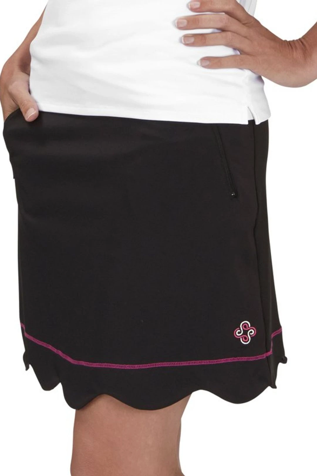 This classic scallop edged skirt has a sleek yet flattering look and provides the perfect pop of color with the fuchsia stitching. With two front zippered front pockets and one horizontal back slit pocket this skirt will meet all of your golf needs!