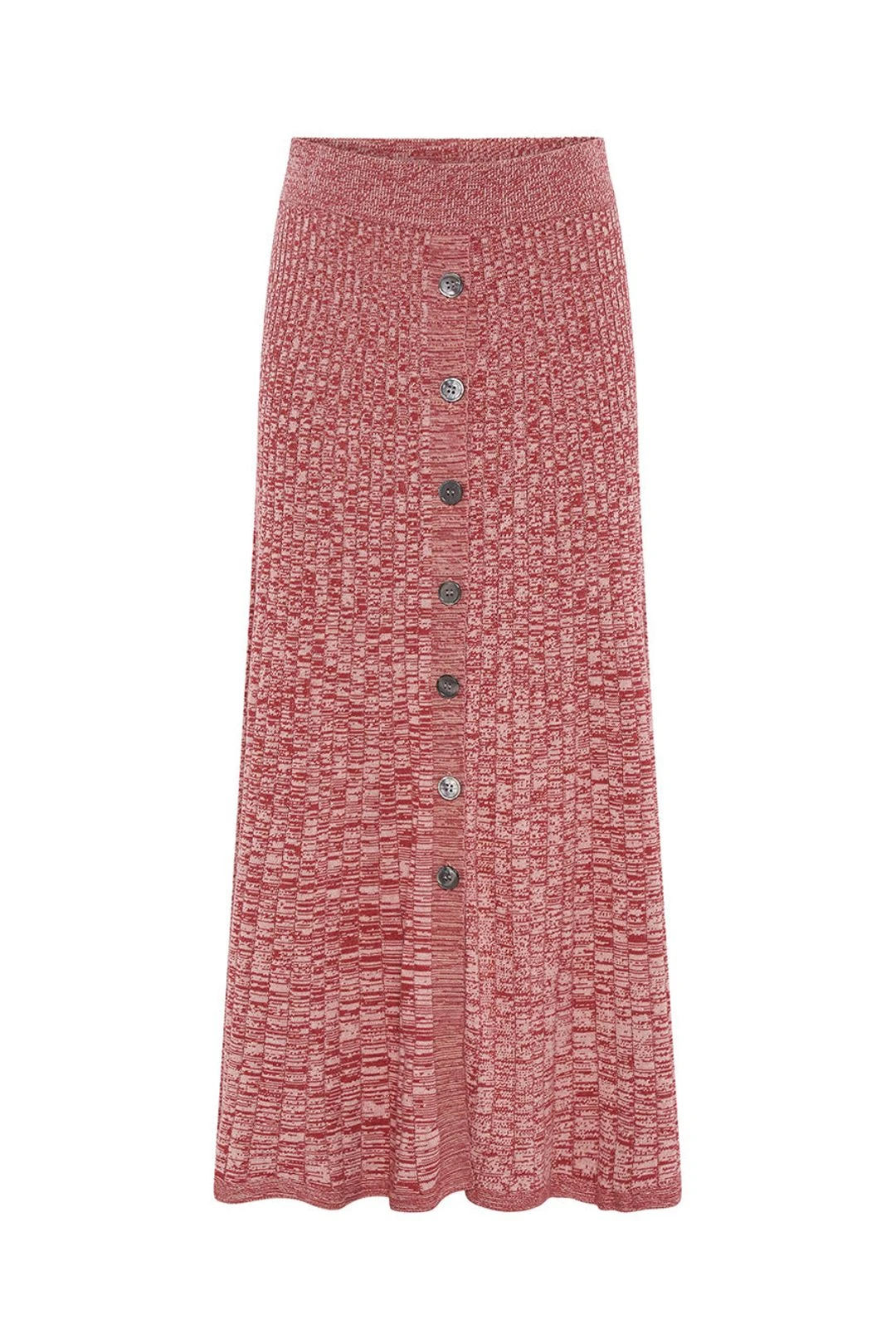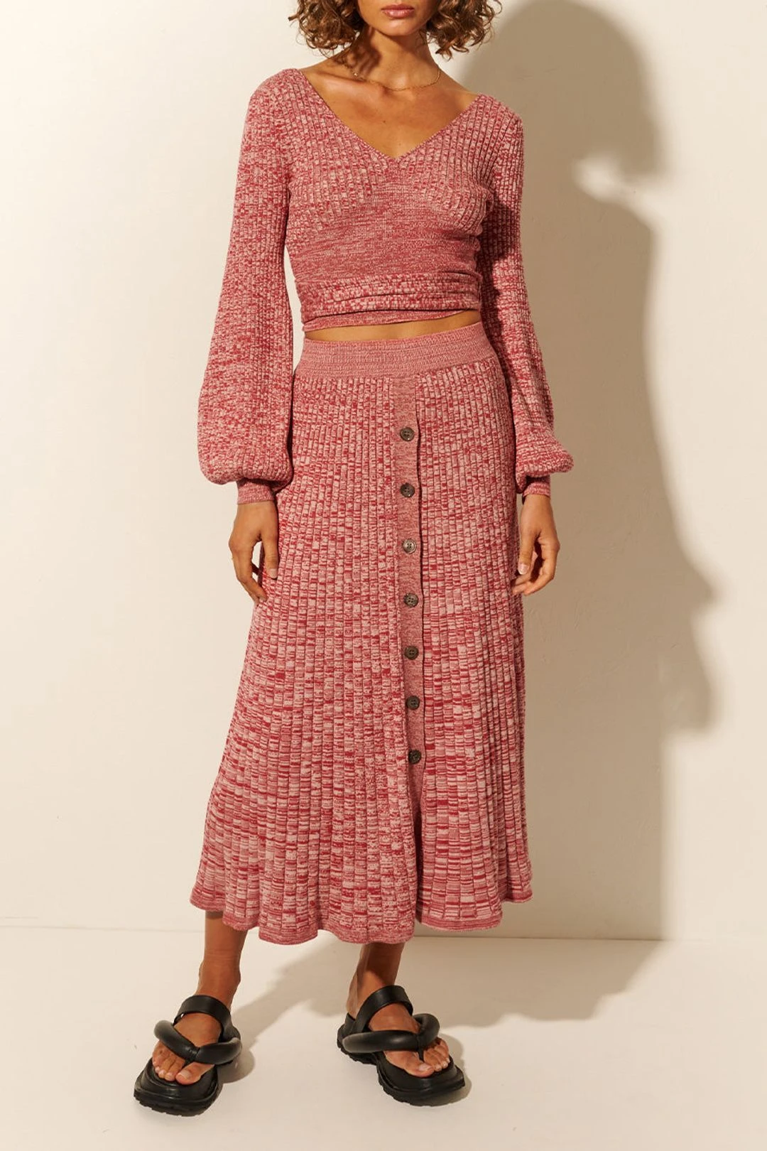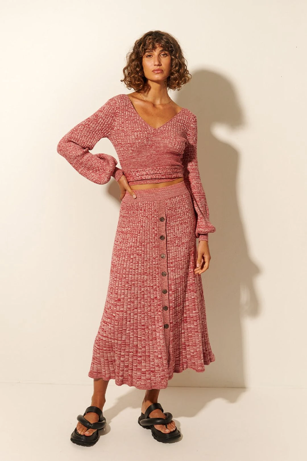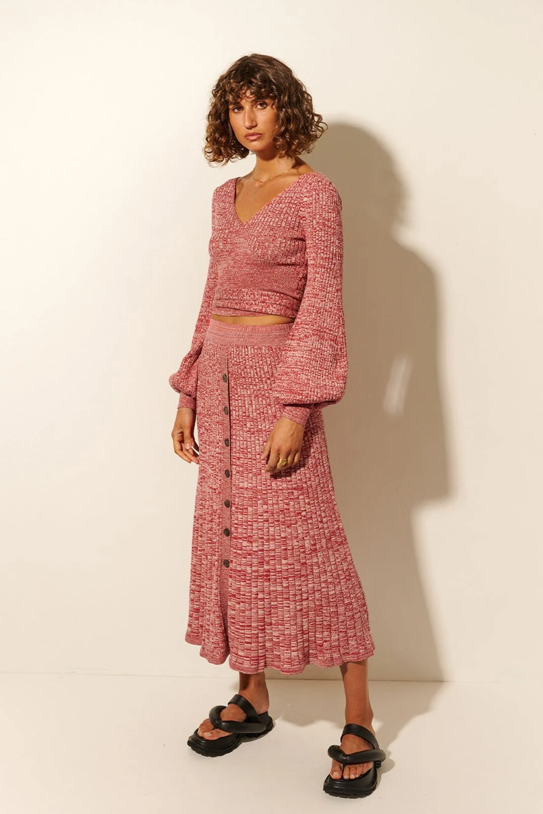 Yolanda is an elevated take on knitwear, crafted consciously in natural fibres. The Yolanda Midi Skirt is a berry-tone, timeless silhouette featuring rib knit stitching, a wide elasticised waistband and tortoiseshell buttons. Pair with the Yolanda Knit Wrap Top to complete the set.