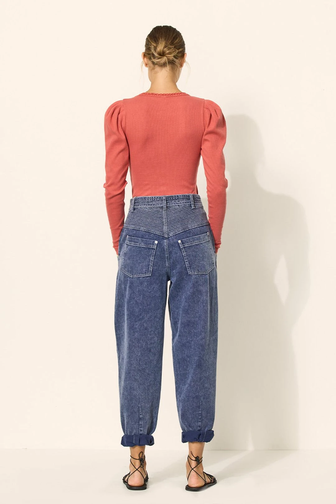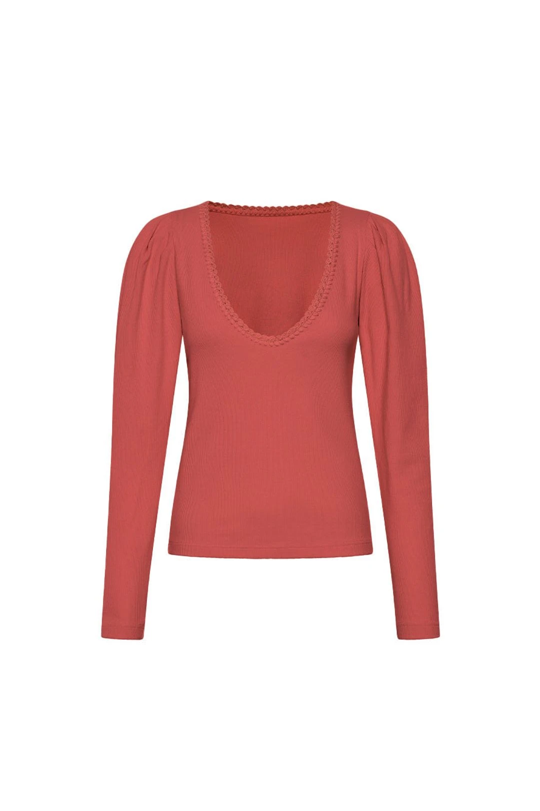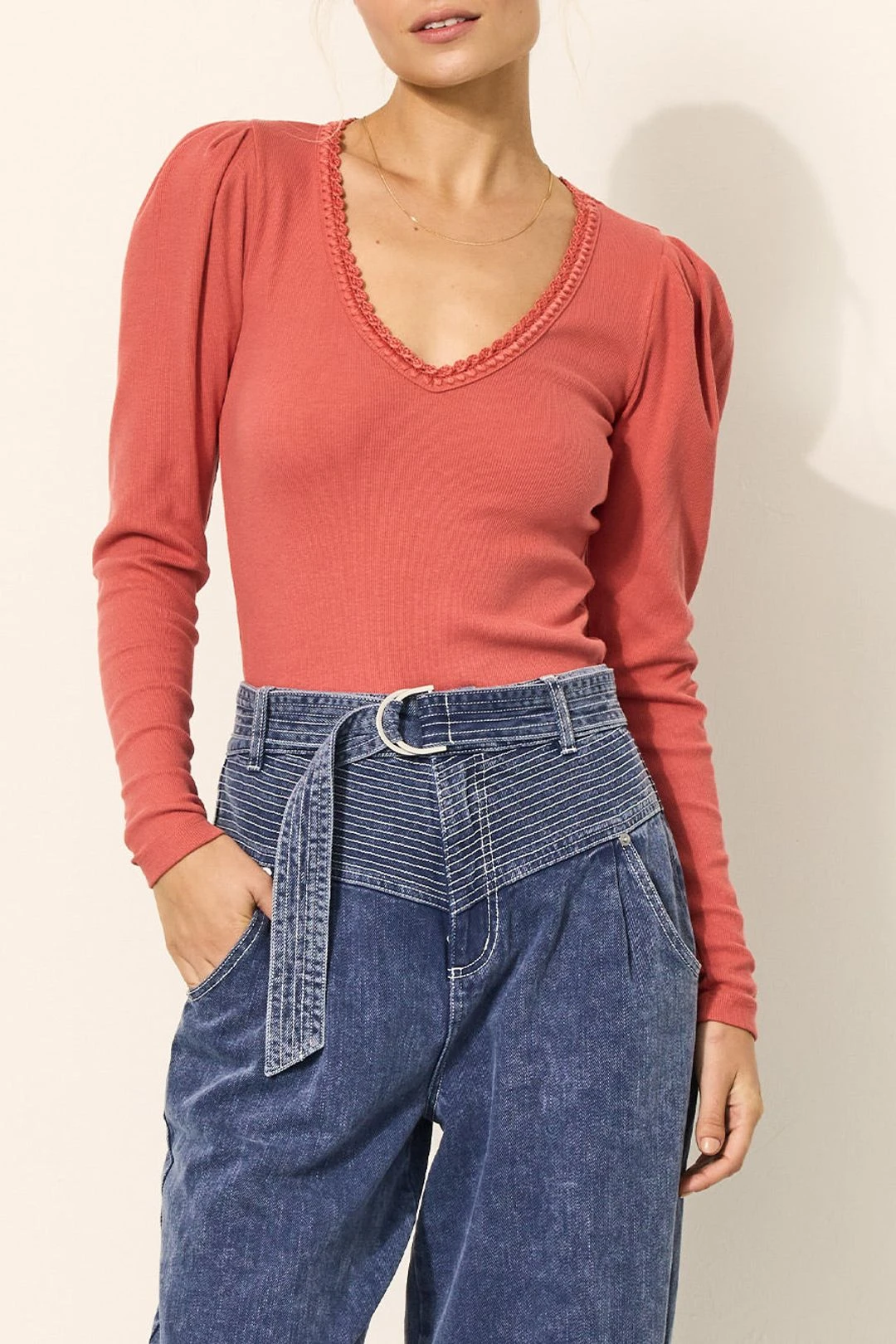 The Zana Top is a slim fit silhouette, ideal for layering. Featuring a soft v-neckline with a crochet trim, gathered shoulders and full length sleeves.
